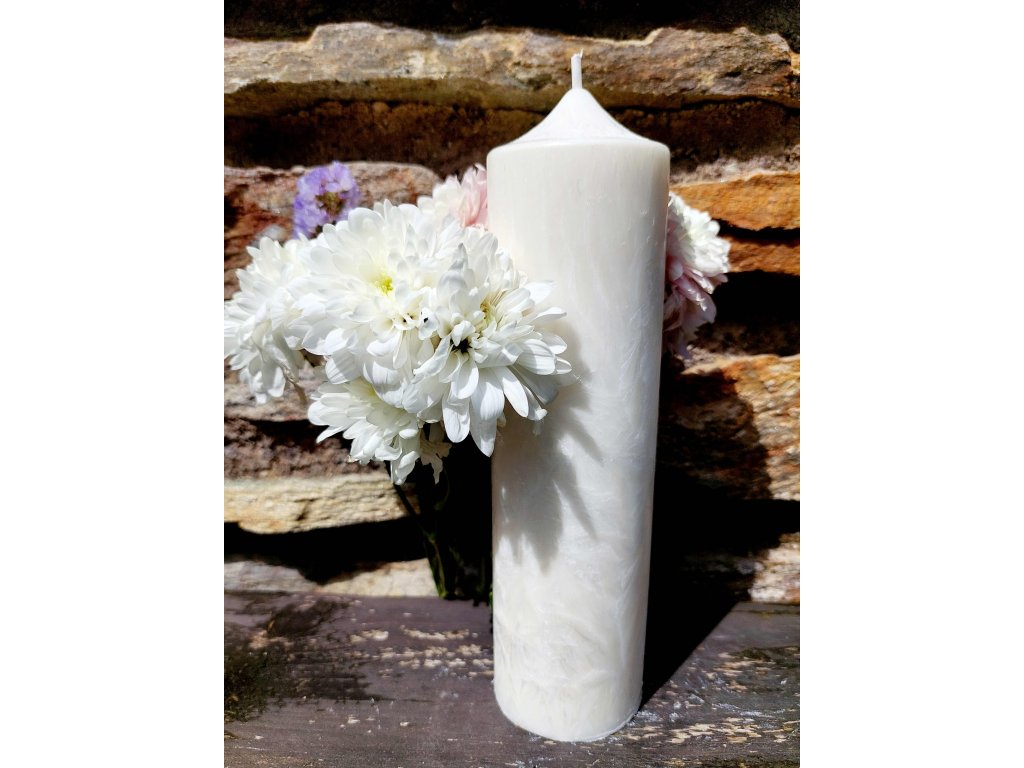 Bílou svíčku můžete použít na váš svatební stůl nebo si ji zapálit v pohodlí domova, pro navození klidu a harmonie. Už jen samotný pohled na svíčku a její úchvatné obrazy je uklidňující a neopakovatelný.